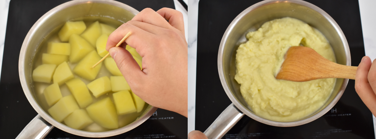 3. ジャガイモにスッと串が通るくらいまで茹でたらザルに上げ、しっかり水気を切って鍋に戻す。