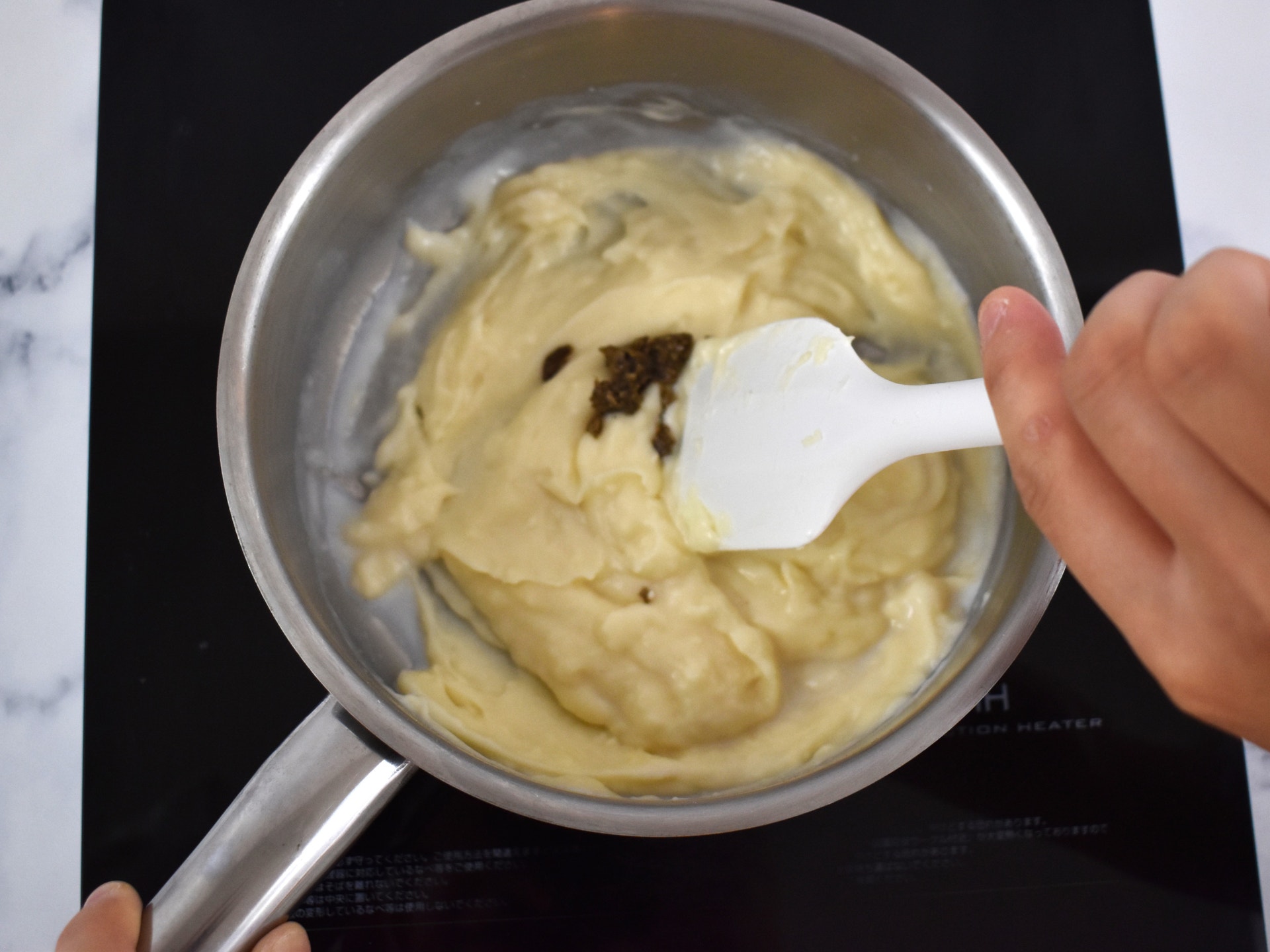 4. 3に牛乳、生クリーム、バターを加えて木ベラで潰しながら再び火を入れ、焦げないように滑らかに仕上げる