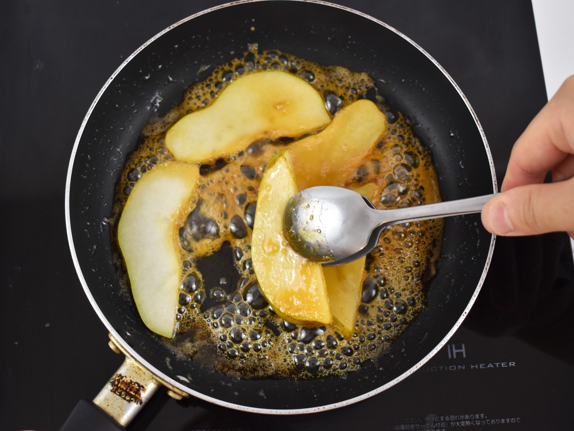 8. フライパンに蜂蜜を入れ、火にかけて、少し茶色く焦げ色がついてきたら洋梨を加えてさっと絡ませる。