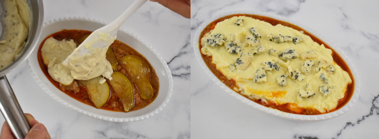 10. 9にデュクセルを全体に広げ、その上にマッシュポテトも全体に敷きこむ。ボロネーゼ → 洋梨 → デュクセル → マッシュポテト の順番に層をつくるように敷き詰めていく。