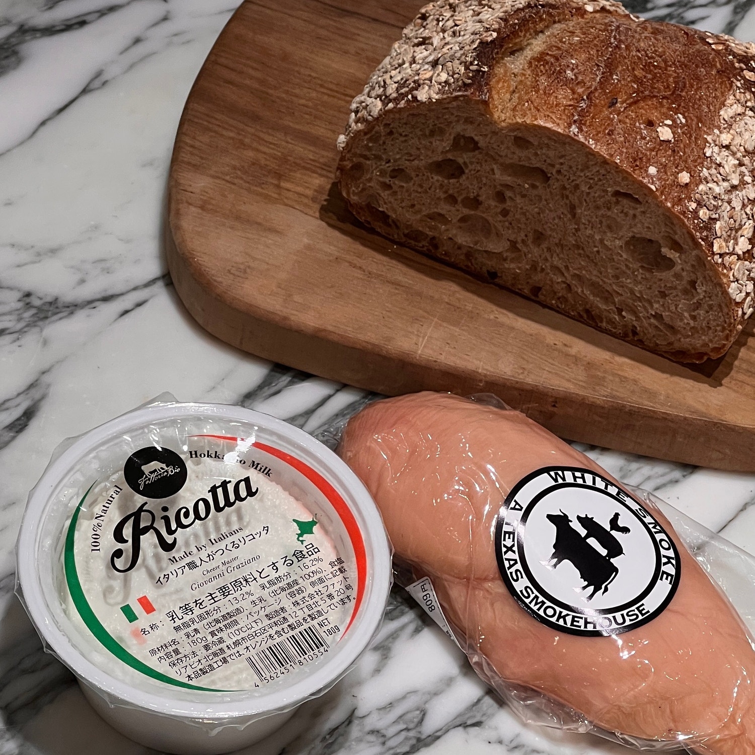5. スライスした雑穀パンにリコッタチーズをたっぷり塗り、スライスしたスモークチキンと野菜を彩りよく乗せる。最後にオリーブオイルと塩をさっと回しかけ、仕上げにバルサミコソースをかけて出来上がり(写真はバルサミコソースなし)