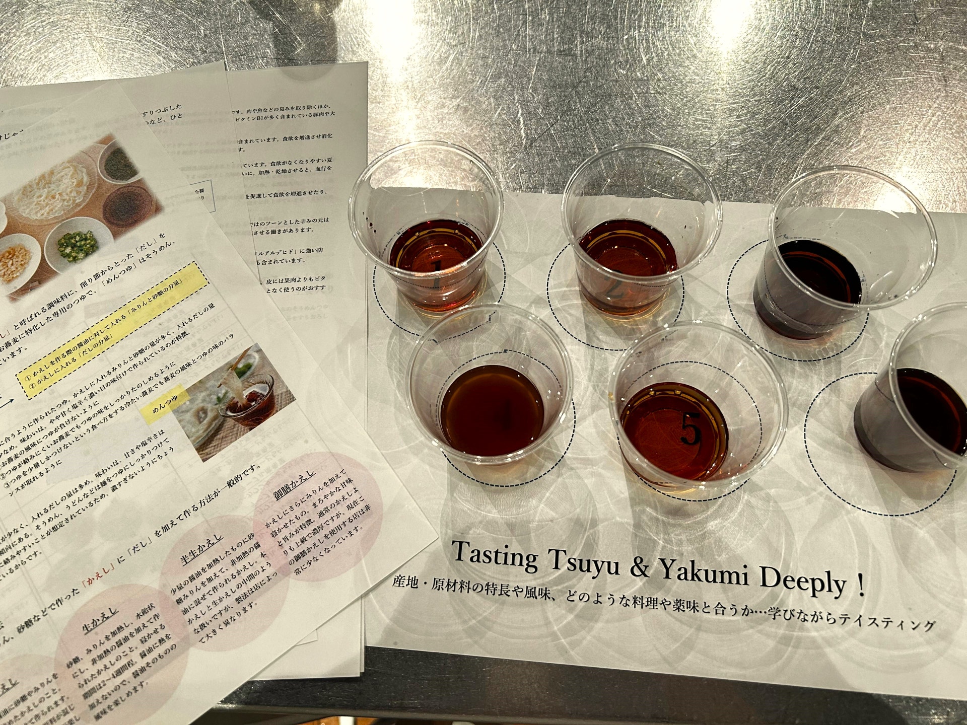 「これは出汁の味わいがしっかりしてるから、香ばしい蕎麦に合うよね」「これは甘さがあるから親子丼とか肉じゃがにも使ってみたい」「こっちはさっぱりとしゃぶしゃぶにいいかも…」など様々な意見で盛り上がり、たのしく学びながらつゆの世界を感じることができました。