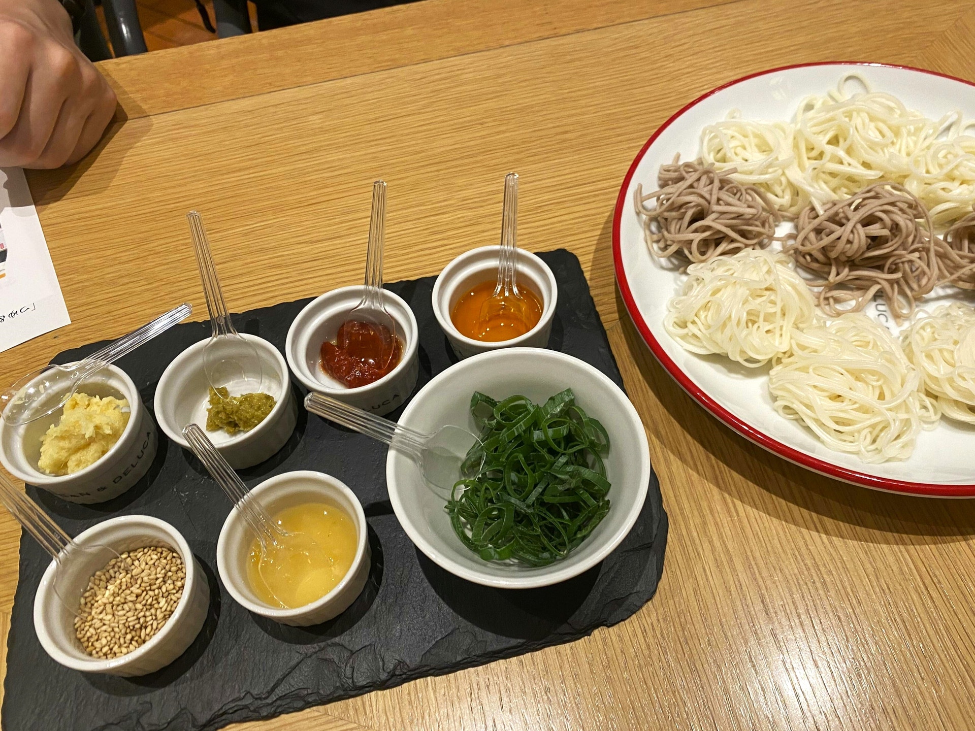 つゆをそのまま飲み比べたあとは、ねぎ、ごま、ラー油、柚子胡椒、しょうがなどの薬味を合わせて味変させながら食べ比べ。つゆは飲み比べることで、醤油のコクが効いているもの、出汁がしっかりしているもの、砂糖の甘さが強いもの、それぞれ全く違った味わいに驚き。商品によっては、使用する原材料にもこだわりがあり、つくり手の想いもしっかりと感じることができました。