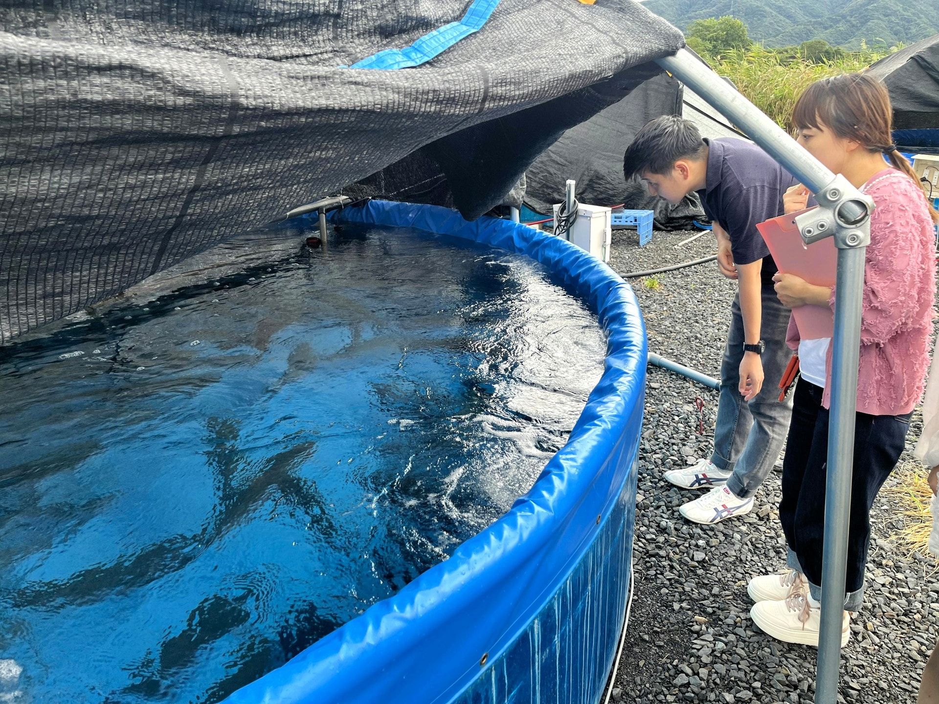 車で近づくにつれて、丸いドーム状の大きな水槽ハウスが何個も広がっていました。代表の平山さんにお出迎えしていただき目にしたのは、海上でなく陸上養殖による「桃太郎サーモン」がそこにはたくさん泳いでいました。立地に制限がなく海や川などから離れた内陸部でも海水魚の陸上養殖を行うことができ、赤潮や病原体侵入の恐れの心配がないのが特徴。天然地下水で育てるため、赤潮の被害もなく虫も入らず安心で安全、稚魚のときから餌に乳酸菌を混ぜて与えることにより、甘みと旨みがありかつ臭みのないおいしいサーモンをつくることが可能。また、魚の生育に適した環境と沈殿物の集積の為に、渦の水流を発生させるそう。