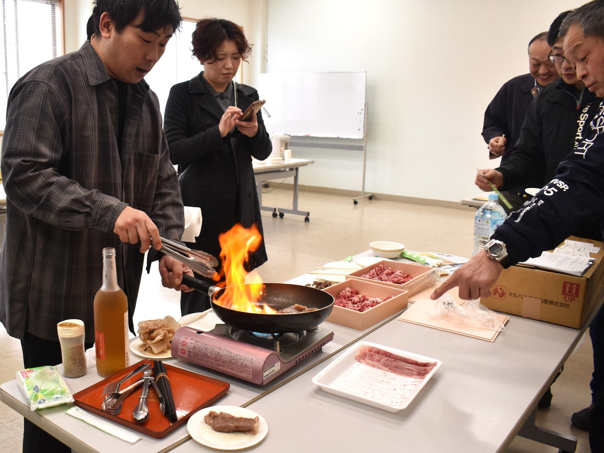 『浅岡牧場』では、約600頭の黒毛和牛を育て、霜降りだけでなくオレイン酸に注目し、脂の質を高めた「りんご和牛」を生産。餌にりんごを取り入れることで、味の差別化を。吉川シェフがその場で調理してくれましたが、すごい!脂身が口の中で程よく溶けて美味確定。次に創業200年以上もの伝統ある酒蔵『松葉屋』。中硬水の地下水を活かし、大きな和釜で蒸した酒米を使ってつくった古酒のおいしさは格別。熟成には時間がかかりますが、約10年で味が完成。山廃に似た奥深い味わいにうっとりしました。