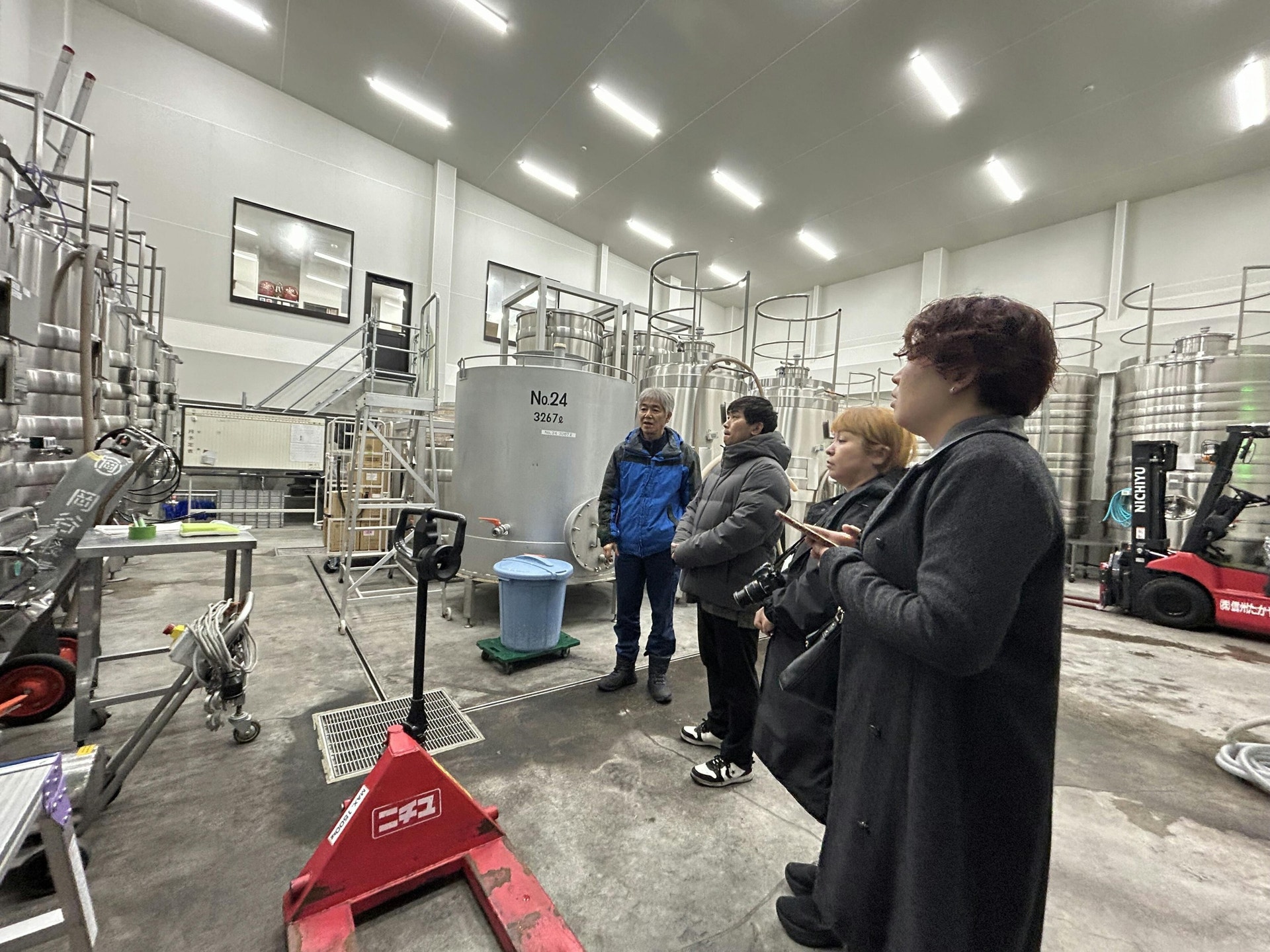 ワイナリーに向かう途中から、広大な土地に整備された一面のブドウ畑が。長野県は国内全国有数のワイン産地で、冷涼な気候と多様な四季がぶどう栽培に適しているのだそう。『たかやまワイナリー』がある高山村は、1996年から栽培が始まり、現在では約64haの畑を持つブドウの産地となりました。ワインづくりで最も重要なのは「収穫のタイミング」と「醸造」とのこと。ブドウは実際に食べて状態を見極め、その年ごとの個性に合わせてつくり方を決めているそう。つくり手の考え方や土地(テロワール)によって味わいが変わるのも特徴。そして、醸造所は高低差を活かした設計で、ポンプを使わず重力でワインを移動させるなど、品質を重視した工夫が施されています。冷涼な気候を利用して酒石除去を行うなど、自然の力も活用。こちらでつくられるワインは基本的に日本の食文化に合うよう、クリーンでバランスのよい辛口が中心に。品種にはこだわらず、その年のぶどうの個性を活かした味わいを大切にされていました。