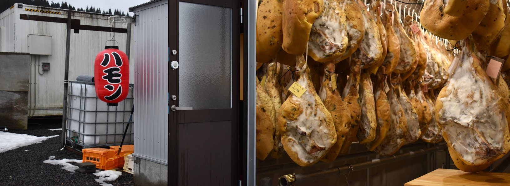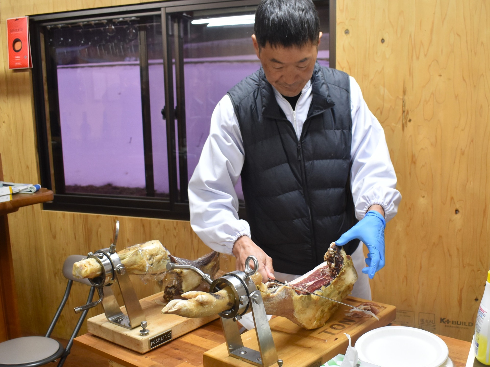 ワインぶどう栽培家の佐藤明夫さんが秋田県の工房で修業したのち「ハモンセラーノのおいしさをもっと知ってもらいたい」と、2013年にこの工房を立ち上げました。ここでは、毎年11月から3月にかけて仕込みを行い、年間約350本の生ハムを製造。製法は乾燥と熟成を重ねる伝統的なスタイルで、敢えてカビを付けることでナッツのような香りと深い旨みが引き出されます。1年ほど乾燥させた後、さらに熟成庫で時間をかけて熟成させ、仕上げにカビを落としてラードを塗り、品質を保ちながら風味を整える。通常は1〜2年の熟成ですが、希望により3〜4年の熟成も可能とのこと。豚の脂質によっては長期熟成に向かない場合もあるのだそうです。すべてひとりで作業されており、農業歴35年、ハムづくりは約13年。佐藤さんが手掛けるハモンセラーノは、丁寧な手仕事と時間をかけた熟成によって生まれる、濃く奥行きのある味わいが本当に魅力でした。