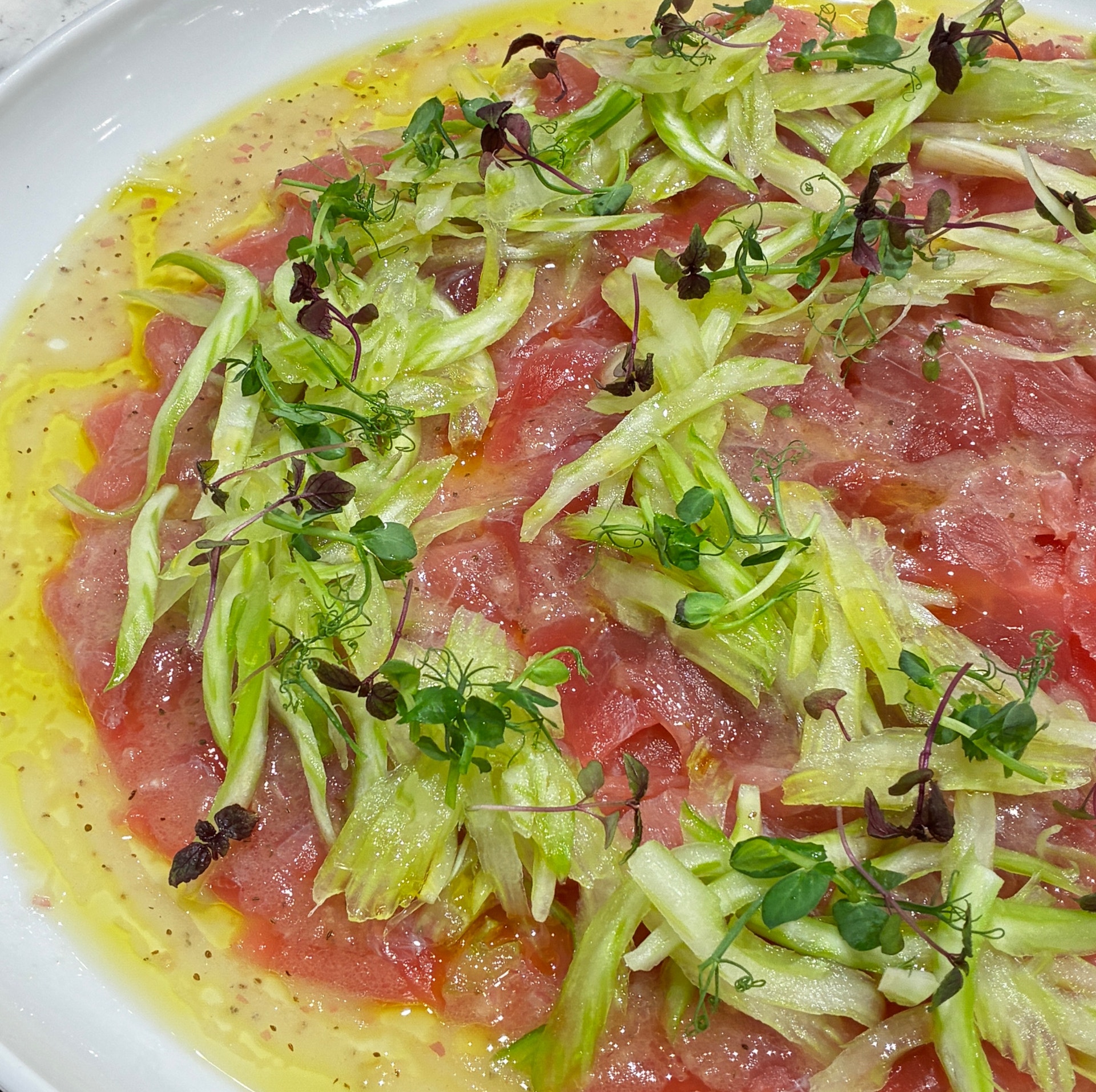 実際には収穫時期ではなかった為、現地で食べる事が叶わなかったセロリですが今回は脂が適度に入った赤みのマグロと、フルーツセロリ特有の甘味が合うと思い、ソースにはヴィネグレットを合わせてさっぱりとした料理に仕上げました。