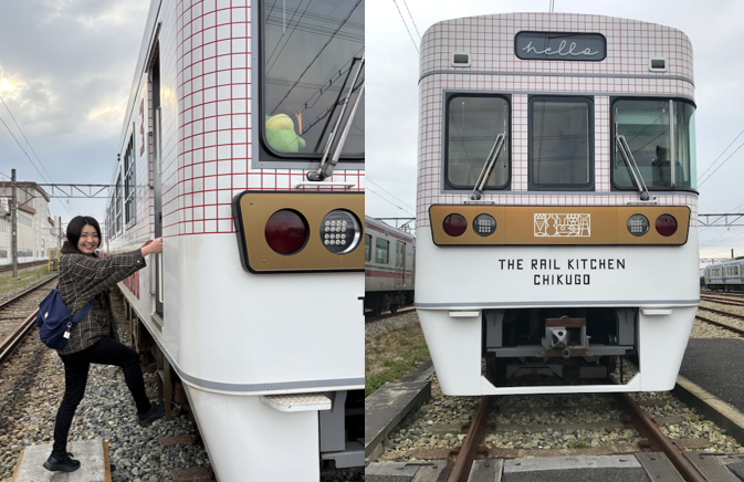 リハーサル当日、まずは西鉄の車両基地に向かい食材をレールキッチンに積み込みます。鉄道好きな方は、きっと興奮するであろう、様々な車体が並んでいる中、一際キラキラと輝くのが、RAIL KITCHENの車体。車両基地ということでいつも乗り込むドアではなく、乗務員室のタラップから乗り込みさせてもらいました。これも中々できない経験だよね…とワクワクしながら車内へ。