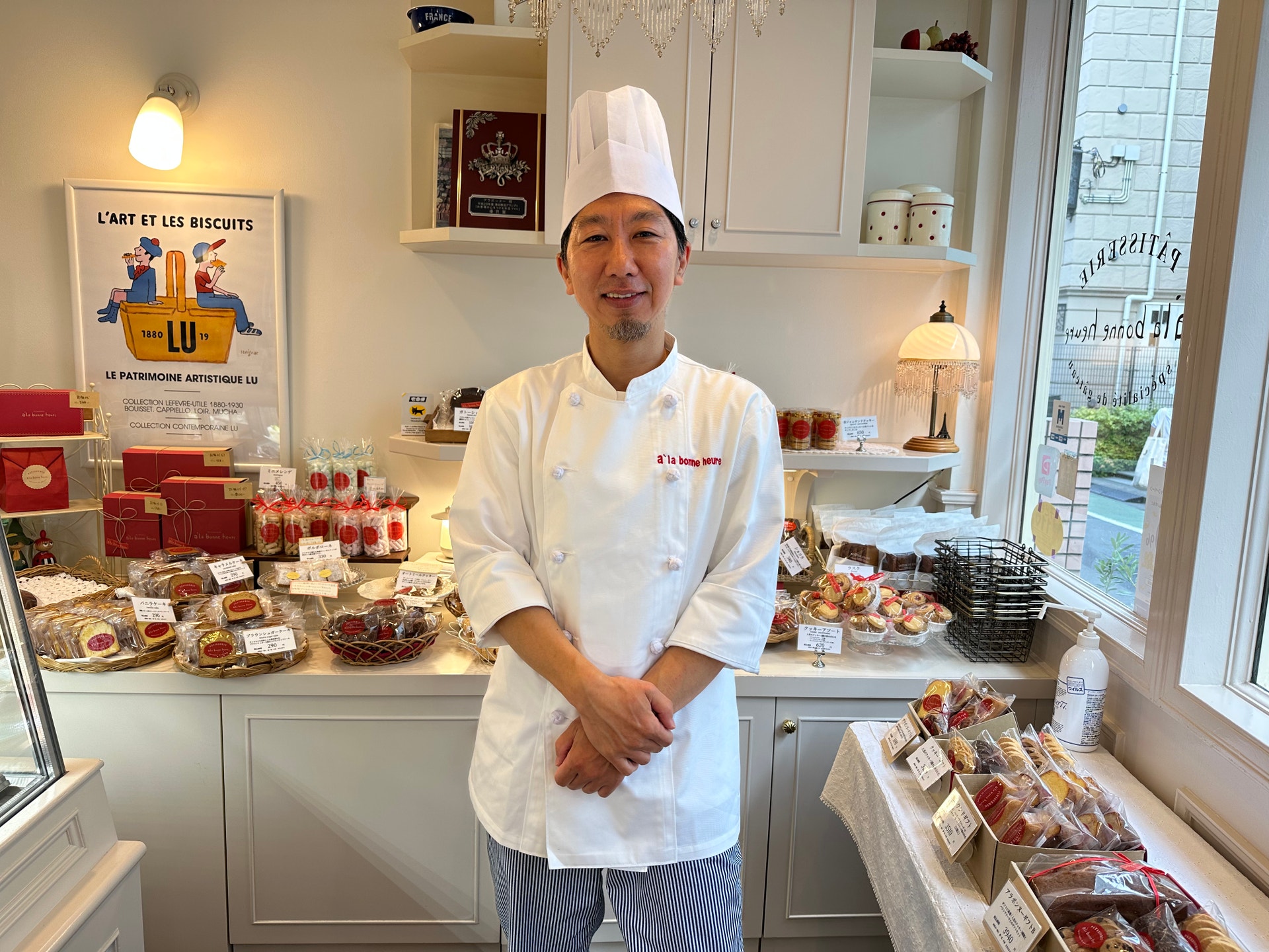 赤坂の白壁に囲まれた小さなパティスリー a la bonne heure(アラボンヌー)。オーナーシェフの坂本和哉さんは、「キルフェボン」での修業を経て、2000年に自身の店をオープンしました。開店以来、バターや卵、生クリーム、フルーツなど、良質な素材にこだわり、店奥の工房で一つひとつ丁寧に手づくりを続けています。なかでも焼き菓子には新鮮な国産バターのみを使用。お店の温かな雰囲気と、坂本シェフの穏やかな人柄をそのまま映したような、優しい味わいが魅力です。